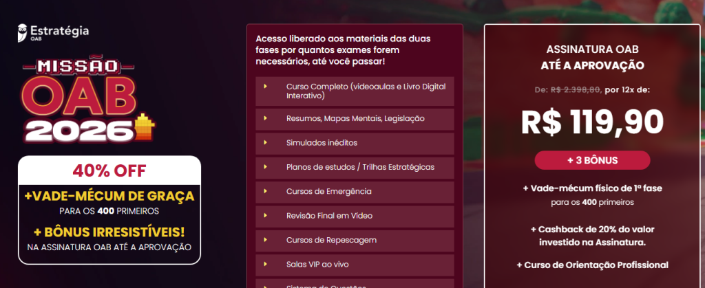 A Missão OAB 2026 começa oficialmente com MATERIAIS EXCLUSIVOS, pensados para quem quer entender o Exame de Ordem e iniciar 2026 com um plano claro e eficiente.